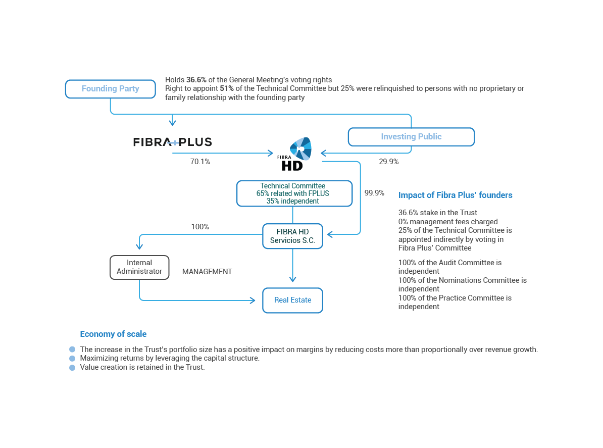 Fibra HD is internally managed by the Advisor and Administrator, which is a civil organization of which Fibra HD holds a 99.9% stake. The Advisor and Administrator is entrusted with identifying investment opportunities, submitting them to the Technical Committee for consideration and, if applicable, managing the investments and divestments of the Trust's assets.