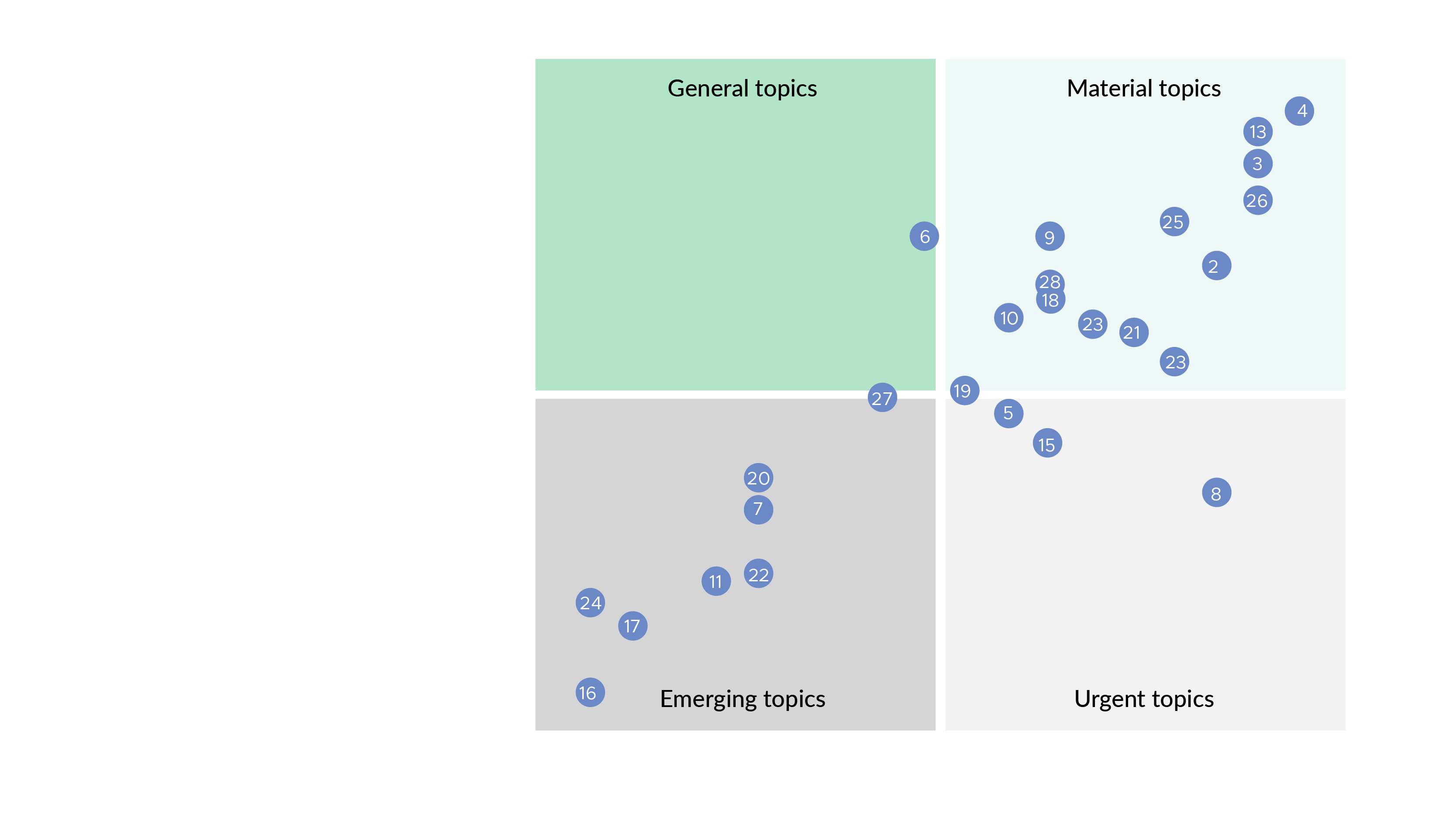 In 2020, to develop our ESG strategy, we conducted our first materiality assessment. With this, we can ensure that our strategy will have the greatest possible impact on our stakeholders. The objective of a materiality assessment is to define which are the material (or most important) issues for the organization and its stakeholders. In this way, we aim to optimize resources by executing strategies that generate the greatest benefit for all, as well as to recognize potential operational risks. Through this assessment, we identified 14 material topics.