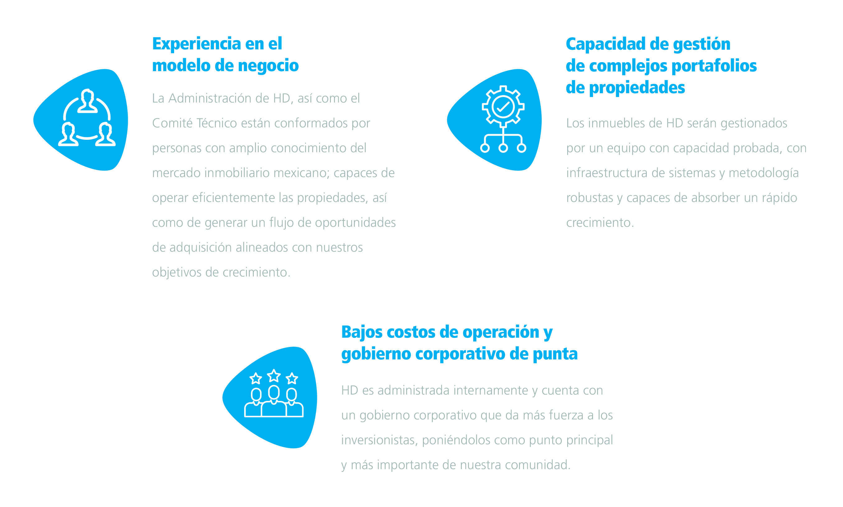 Fibra HD ha sido concebido para adquirir, poseer, construir, arrendar y operar un amplio rango de Inmuebles en México. La FIBRA tiene como objetivo principal proporcionar retornos atractivos con riesgo ajustado a largo plazo a los Tenedores, mediante Distribuciones de Efectivo estables y la apreciación de sus Activos. Dicho objetivo se logrará creando, de manera selectiva, una cartera diversificada de Bienes Inmuebles que se destinarán al arrendamiento o de Derechos de Arrendamiento.